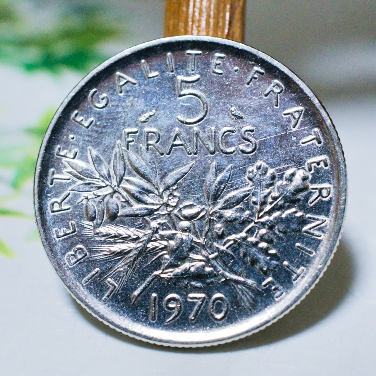 フランスで1969-2001年に発行されていた5フラン。フランス共和国の国章である"種撒き人"(The Sower)はオスカー・ロティが1900年にデザインしたものです。年号と共に描かれているのはオリーブの枝・オークの枝・小麦の穂です、全体に描かれており繊細で見栄えが良い綺麗なベルに仕上がりました。