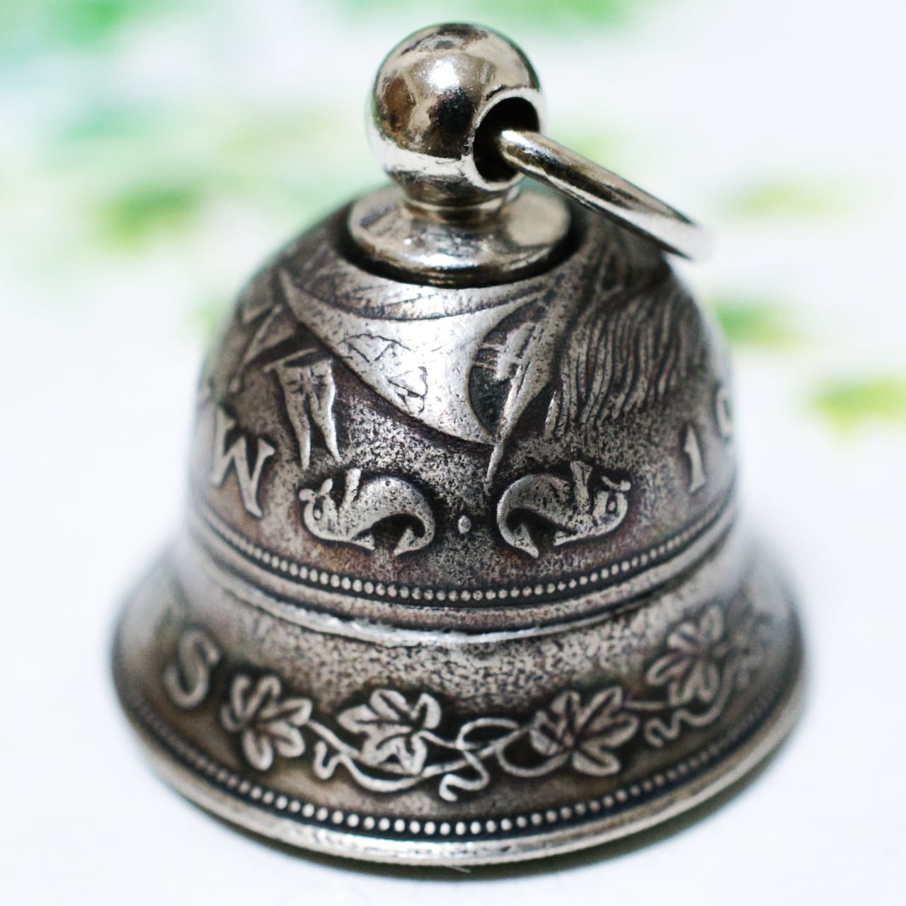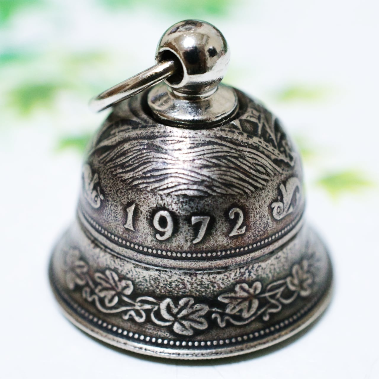 イルカは愛や平和・海に住む守り神として有名で、日本でも縁起のよいモチーフとして好まれています。ブドウの葉の花冠が描かれており華やかな印象のベルに仕上がりました。